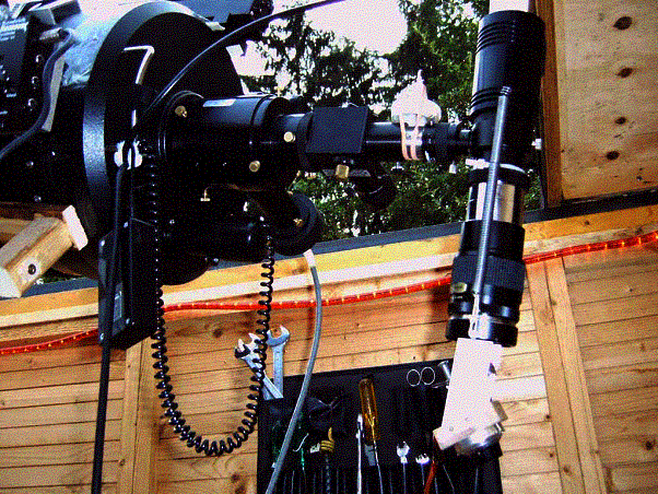 My sensors are the lightweight MX916 (Starlight) or the famous ST-6 (SBIG). During operation the whole assembly is being covered by a black piece of cloth to avoid stray light since there is no housing for the sake of simplicity. The object of interest (star) will be adjusted onto the exact optical axis while looking through the flip mirror by means of a crosshair eyepiece.