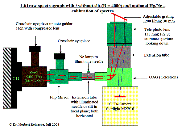 I tried hard to use parts that are in the possession of amateur astronomers anyway. One of the most complicated items of any Littrow design is the chamber in front of the CCD-chip holding the adjustable folding mirror/prism. Its construction usually requires sophisticated tools and material. To avoid this effort completely I decided to make use of an already existing Off-Axis-Guider (Celestron, CA USA). Firstly it was necessary to rotate the prism 180° in its housing. Secondly the small distance ring was removed so that the prism’s location would be shifted a bit closer to the optical axis. A regular telephoto lens (135 mm) was then attached to the guider’s flange by means of two rather strong springs since no adapter was at hand. The CCD-Camera was screwed to the other side of the guider’s housing.